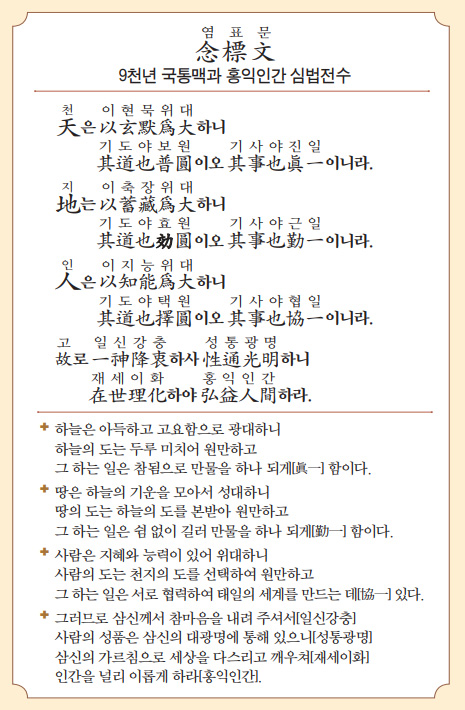 다시 말해 염표문에서 말한 인간의 사명은 ‘하늘과 땅과 인간의 본성은 하나이며 인간 속에 내재한 천지의 광명을 그대로 발현하여 천지의 꿈과 이상을 이루는 인간이 되어라’ 하는 것입니다. 그것이 홍익인간弘益人間의 진정한 뜻입니다.