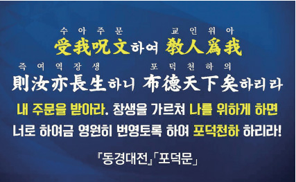 그래서 상제님께서 ‘제우야, 나의 주문을 받아서, 천하창생이 나를 위하도록 가르쳐라. 아버지를 직접 만나도록, 아버지와 하나가 되도록, 아버지를 받들도록 가르쳐라’고 하신 것이다. 그렇게 해서 새 세상의 문을 여는 포덕천하를 이루면 ‘여역장생汝亦長生’, 너도 영원히 산다고 하셨다. 이것은 최수운 대신사뿐만 아니라 온 인류에게 하신 말씀이다. ‘수아주문 교인위아’를 가슴에 새기고, 써서 집에도 걸어놓아야 한다.
