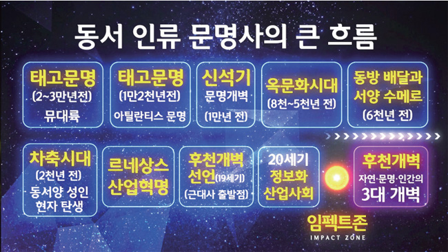 그런데 지금까지 사물을 보는 거울과도 같은, 진리를 깨달아 진리의 전체 그림을 볼 수 있는 눈동자가 약했다. 그것이 바로 우주관, 우주 일 년 이야기다. 우주에서 인간 농사를 짓는 봄, 여름, 가을, 겨울이 있다. 지구 일 년 사계절에 초목 농사를 짓듯이, 우주는 인간을 내고 길러서 거둔다. 그리고 문을 닫아 휴식기를 갖고 다시 봄에 농사를 시작한다. 그게 바로 우주의 봄여름과 가을겨울 이야기다. 선후천 개벽 이야기다.