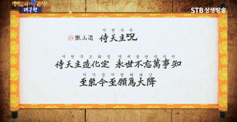 시천주주의 본주문 ‘시천주조화정 영세불망만사지’는 진정한 새 세상의 새 역사 주제를 나타내고 있어요. 그리고 가을 우주 생명을 받는 노래가 ‘지기금지원위대강至氣今至願爲大降’ 여덟 자인데 이것을 천주의 성령을 받는 주문, 강령주문이라고 합니다. 시천주조화정侍天主造化定, 얼마나 간단해요? 천주를 모신다, 천주를 모셔라, 천주를 모시면 조화정이 된다, 이겁니다.