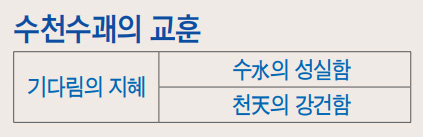 수괘需卦의 괘덕을 보면 위의 물(☵)은 충실한 덕성이 있고, 아래의 하늘(☰)은 강건한 덕성을 가지므로 비로소 편안하게 머물면서 명命을 기다릴 수 있게 된다. 반면에 유약한 사람은 어려운 때에 가만히 기다리고 있을 수가 없어 조급하게 경거망동을 하게 된다고 한다. 그래서 『중용』에서는 “군자는 편안하게 머물면서 청명을 기다리고, 소인은 험한 데를 행하면서 요행을 기다린다.”라고 하지 않았던가?