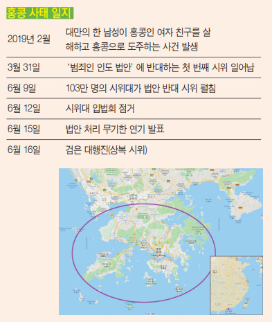 홍콩이 상복을 상징하는 검은색으로 변했다. ‘범죄인 인도 법안’의 완전 철폐와 캐리 람 홍콩 행정장관의 사퇴를 요구하는 검은 옷의 시위대가 6월 16일 홍콩을 뒤덮었다. 집회 주최 측 추산으로 200만 명이 넘는 홍콩 시민이 참가했다고 한다. 홍콩 시민 740만 가운데 세 명 중 한 명꼴로 시위에 참여한 것이다. 이는 1997년 홍콩 주권 반환 이후 22년 만에 사상 최대 규모다. 홍콩 전체 역사상으로도 1989년 150만 명이 톈안먼 민주화 시위를 지지했던 시위를 훨씬 능가하는 숫자다. 7월 1일 홍콩 반환 기념식이 벌어질 때, 일부 시위대에 의해 홍콩 입법회가 점거되기도 했다.