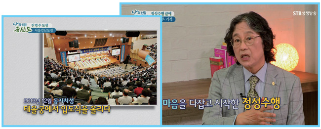 그날 이후로 다른 방송은 안 보고 상생방송만 굉장히 오랫동안 봤습니다. 그리고 114에 전화해서 가장 가까운 도장을 물어 강남도장으로 찾아갔습니다. 당시 책임자이셨던 이승계 수호사님을 통해 우주1년 얘기를 듣고나서 가려던 참에 “증산도에서 모시는 분을 보고 가시겠습니까?”라고 하시어 성전에 처음 들어가보게 되었습니다.