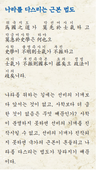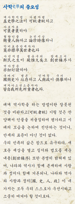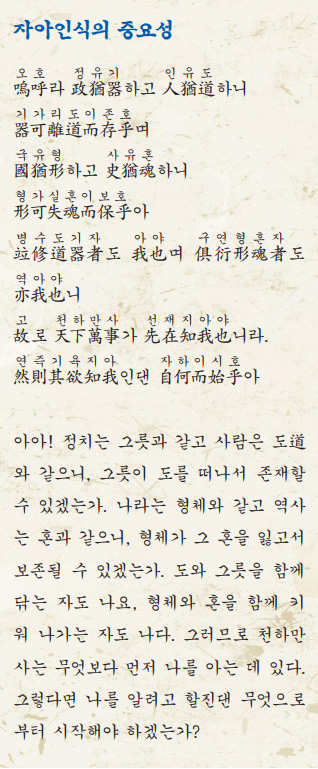 아아, 정치는 그릇과 같고 사람은 도와 같으니 그릇이 도를 떠나서 어떻게 존재할 수 있으며, 나라는 형체와 같고 역사라는 것은 그 형체를 움직이는 혼과 같으니, 형체가 혼을 잃어버리고 어떻게 보존이 될 수 있겠는가. 도와 기를 함께 닦는 자도 나이고, 형체, 몸뚱이와 혼을 함께 갖고 살면서 그것을 키워 나가는 것도 역시 나이니, 그러므로 천하만사는 무엇보다 먼저 나를 바르게 아는 데 달려 있다.