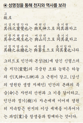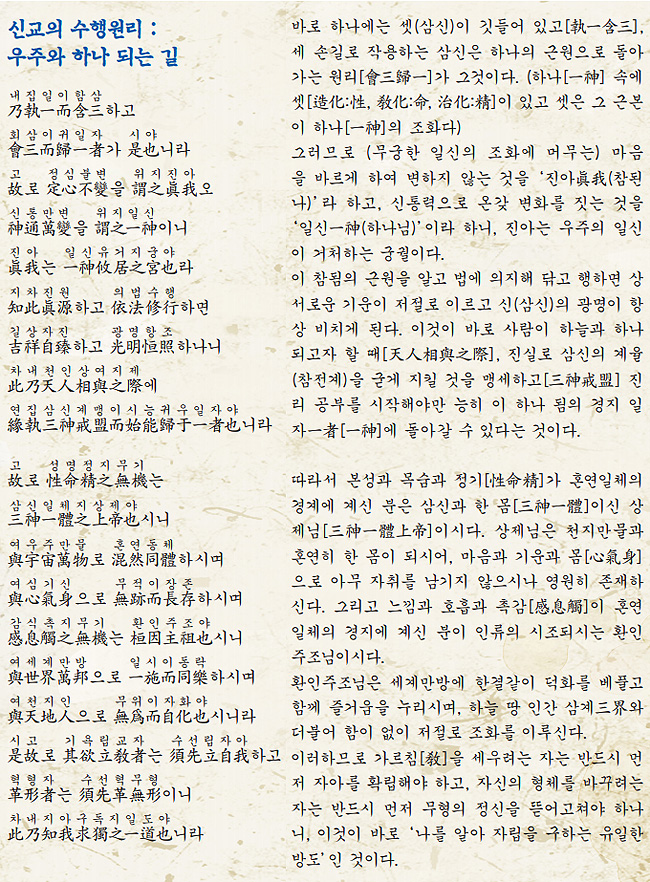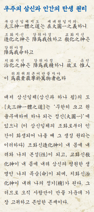 삼신의 영원한 생명이 우리 인간의 몸을 통해 현실의 삶으로 나타나는 것은, 바로 저 산천, 대자연과 더불어 그 기가 동일하고, 즉 천지와 더불어 내 몸의 기가 같다는 말씀이다. 또 내 몸의 정기가 자손을 통해 영원히 지속될 수 있는 것은 창생과 더불어 그 하는 일이 같으니. 바로 천지의 뜻과 목적을 세상 사람들과 더불어 이뤄 나가기 때문이라는 말이다.