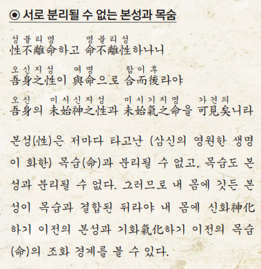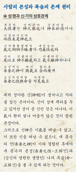 이러므로 신은 기를 떠날 수 없고, 기는 신을 떠날 수 없나니. 신은 기를 타고 또 기 속에는 신이 있잖은가. 그 기를 움직이게 하는 신의 손길이 있다. 내 몸속에 있는 신이 기와 더불어 하나가 된 후에, 내 몸속에 있는 성과 명, 하나님의 마음과 하나님의 무궁한 생명의 경계를 가히 볼 수가 있다.