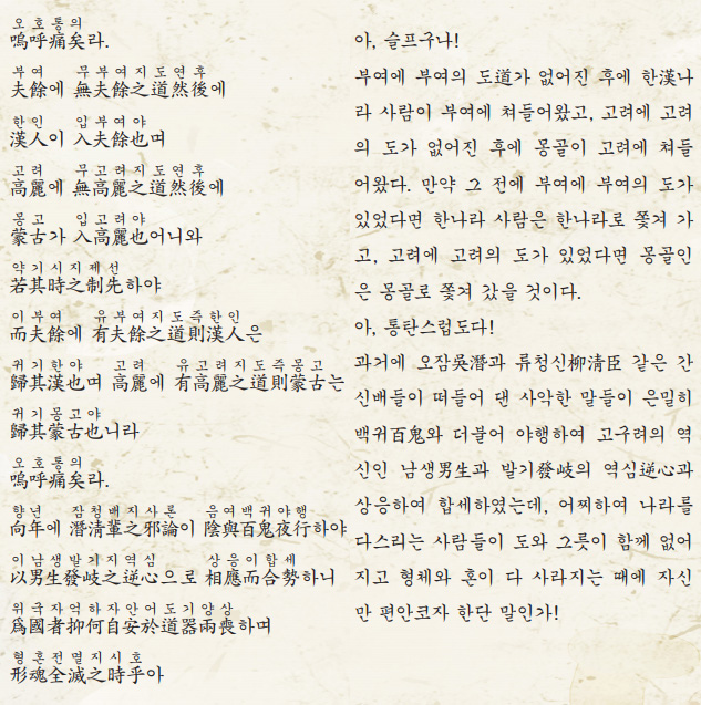 오호 슬프도다. 부여의 원도인 신교의 도가 없어진 연후에 한인들이 부여에 쳐들어왔으며. 한나라 무제가 옛 환국, 배달, 조선의 땅을 다 먹어 버리려고 부여를 침략하지 않았는가.