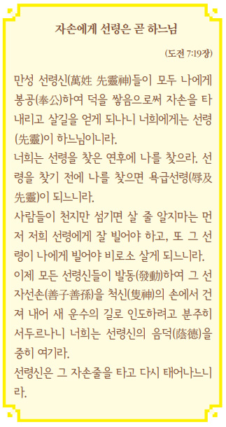 A 제가 6살 때쯤 집안 어른들께서 하신 말씀들을 들었던 기억이 나는데요. 증조할아버지께서는 서당을 운영하셨고 증조할머니께서는 열다섯 어린 나이에 시집을 오셨는데요. 주변에서 모르시는 분이 없으셨을 정도로 유명한 분이셨다고 들었습니다. 나중에 수행을 통해 증조할머니께서 보천교를 신앙하셨다는 것을 알게 되었습니다. 그래서 저희 집안이 상제님 신앙과 인연이 있었다는 것을 알게 되었습니다.