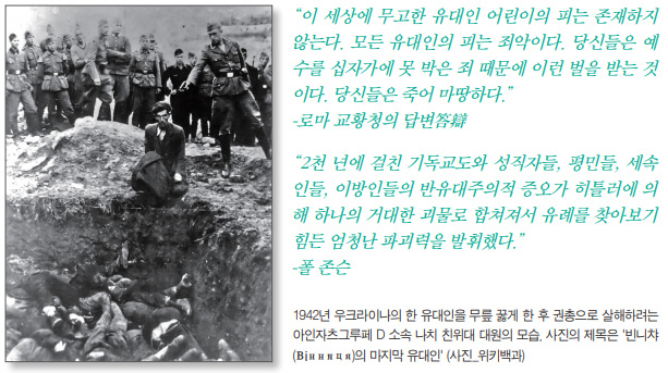 “2천 년에 걸친 기독교도와 성직자들, 평민들, 세속인들, 이방인들의 반유대주의적 증오가 히틀러에 의해 하나의 거대한 괴물로 합쳐져서 유례를 찾아보기 힘든 엄청난 파괴력을 발휘했다.”