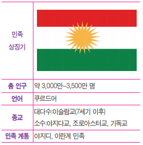 쿠르드족은 중동에서 가장 오래된 민족으로 인구는 약 3,300만 명으로 추산된다. 여러 지역에 흩어져 살고 있는데 한 번도 독립국가를 이루지 못했다. 쿠르드는 이란에서 갈라져 나왔고, 언어는 인도-유럽어족으로 분류되는 쿠르드어를 독자 언어로 사용한다. 종교는 수니파 무슬림이 대부분이지만 시아파 계열 소수종파인 알레비파가 적지 않다. 이 밖에 야르산, 야지디, 조로아스터, 기독교 등 다양한 종교를 믿는 이들이 섞여 있다.