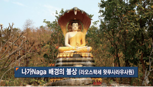 팍세 왓푸 박물관에 있는 부처상을 보면 그 뒤에 보리수가 새겨져 있습니다. 남방 소승불교, 초기 불교의 모습인데 여기 보면 뱀 비슷한 일곱 마리 ‘나가’가 뒤에서 부처님을 받들고 있어요. 나가 전설에, 물가에 있는 뱀들이 회의를 해서 부처님을 잘 돌봐드리자 해서 보호신이 됐다고 합니다. 그런데 저것이 태국에서 캄보디아를 거쳐서 라오스에 가면 용문화로 바뀌어요.