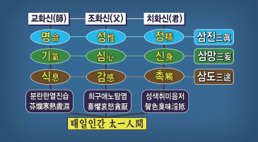 하늘에는 삼신三神, 땅에는 삼한三韓이 있고, 사람 몸속에는 삼진三眞, 세 가지 참된 것이 들어와 있습니다. 우주 조물주 삼신이 모든 사람 속에 살아있는 것입니다. 바로 조교치造敎治 삼신이 우리 몸에 들어와 있어요.
