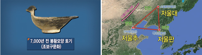 그다음에 홍산문화 유적지에서 5,500년 전 배달국 초기 때 천신단과, 우주 심법을 전수받은 웅족熊族 여신을 모신 사원이 나왔는데요. 우리가 8천 년 전의 사해査海 문화, 7천 년 전의 조보구趙宝溝 문화를 보면 용봉龍鳳 문화의 원형이 환국문화에서 나왔다는 것을 알 수 있어요. 상제님의 아들 천자를 상징하는 용봉 문화는 근 8천 년 전, 환국의 초기에 나온 것입니다.