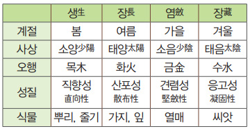 그리고 『헤르메스 문서』에서는 ‘네 개의 원소는 다시 봄·여름·가을·겨울로 나타난다’고 하였는데, 자연의 변화를 살펴보면 그 의미를 쉽게 파악할 수 있습니다. 동쪽에서 해가 어둠을 뚫고 떠오르면 우리는 잠에서 깨어나 움직이기 시작합니다. 남쪽에서 해가 중천에 떠올라 세상을 밝게 비추면 활발히 움직이며 일을 합니다. 서쪽으로 해가 뉘엿뉘엿 지면 일과를 정리하고 집으로 돌아옵니다. 북쪽으로 해가 완전히 지고 어둠이 깃들면 깊은 잠에 빠져들어 다음 날을 준비합니다. 1년 사계절도 마찬가지여서, 봄이 되어 날이 따뜻해지면 식물은 대지를 뚫고 나옵니다. 여름이 되면 뜨거운 태양 빛을 받으며 무럭무럭 자라납니다. 가을에 날씨가 서늘해지면 낙엽을 떨구고 열매를 맺습니다. 겨울이 되어 날씨가 추워지면 씨앗을 저장하고 다음 해를 기다립니다. 이러한 우주 변화의 근본정신을 증산 상제님께서는 ‘생장염장生長斂藏’이라고 하셨습니다.