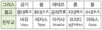 사원소설은 인도에서도 등장했습니다. 불교와 힌두교 및 인도의 고대 신화에서는 이미 우주와 인생을 구성하는 근본 요소를 타트바tattva라고 하여 지수화풍 ‘사대四大(마하-부따루빠)’로 논하고 있었습니다.