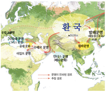 동방에서 온 수메르인들의 문명은 메소포타미아 땅에서 계속 전승되었을 뿐만 아니라 소아시아(지금의 터키), 시리아, 이집트 등지로 전파되었다. 이집트 문명은 수메르보다 대략 500년 후에 번성하기 시작한 것으로 이집트의 건축, 기술, 문자 등은 모두 수메르 문명에서 유래한 것이다. 그리고 그 수메르인들은 동방에서 천산을 넘어온 환국의 이주민들이었다.