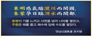 하박河泊의 손자孫子이며 일월日月의 아들인 추모鄒牟 성왕聖王이 북부여에서 나셨으니, 이 나라 이 고을이 가장 성스러움을 천하사방天下四方이 알지니.