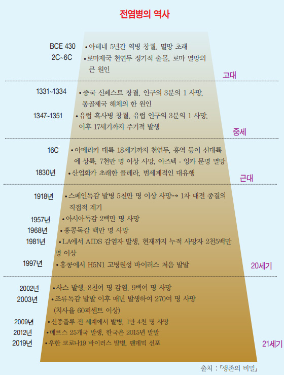 인류 역사를 살펴보면 전염병의 창궐은 반복됐고 패턴도 유사했다. 중세 유럽의 전성기는 흑사병으로 막을 내렸다. 인구의 3분의 1 정도가 목숨을 잃을 정도로 그 피해가 무시무시했다. 소작농이 크게 줄어들자 노동력이 부족해 임금이 상승했다. 그러자 농업 노동자들의 협상력이 커지면서 영주 소유의 땅에서 지대를 내며 농노들이 일하던 낡은 봉건제가 무너지기 시작했다. 일할 사람을 고용하는 데 더 많은 비용이 들어가자, 사업을 운영하는 이들은 인간의 노동력을 대체할 기술에 투자하기 시작했다. 심지어 전염병의 발생이 유럽의 제국주의를 가속화했다는 주장도 있다. 인류 역사를 보면 전염병이 문명 전환의 결정적 역할을 한 사례가 많다.