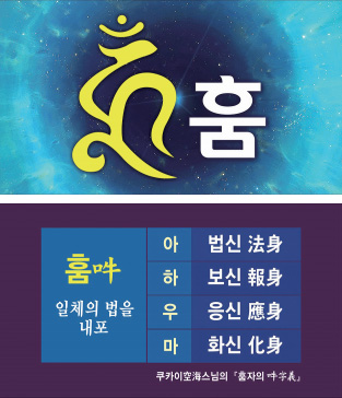 우리가 그 하나를 ‘우주광명 환’이라 한다. 그것이 겉으로 환하게 드러난 것이 우주광명이다. 그런데 그것을 내면으로 가져와서, 우리의 몸과 마음이 우주의 저 깊고 깊은 곳으로 들어가면 그것은 바로 ‘훔’이다. 외면으로는 우주광명 환이요, 내면으로는 우주의 법신, 훔이다.