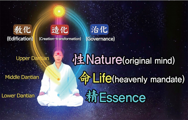 조물주 삼신의 우주의 진리, 세 가지 보배가 내 몸속에 들어 있다. 바로 기르고 깨우치고 다스리는 조물주의 3대 신성이 머리, 가슴, 그리고 배꼽 아래에 있는 현관 즉 하단전에 있다. 이 상단, 중단, 하단이 있는데 이것을 성명정性命精이라 한다. 성명性命, 이것을 정확하게 해석하고 사무치게 깊이 느껴야 된다.