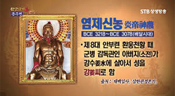 강수에서 살았던 염제 신농씨의 성은 강姜씨입니다. 강씨는 현존하는 성씨 중 가장 오랜 된 시원 성씨이며, 이는 부친인 소전이 강수에 살았기 때문입니다. 또한 염제 신농씨를 열산씨烈山氏라고도 하는데 이는 열산에서 신농씨가 창업을 했기 때문입니다. 열산烈山은 도읍지 이름뿐 아니라, 산의 초목을 불태워 농토를 개간한다는 뜻입니다. 초기에 농토를 얻기 위해서는 근대의 화전처럼 불을 질러 지력을 얻어 농토를 개간해야 했기 때문입니다. 화덕에 의해 임금이 되어 남방을 다스리는 불의 신으로 여겨 염제炎帝라 부르게 되었습니다. 그리고 사람들에게 처음으로 농사법을 가르쳐 주었으므로 신령스런 농부란 뜻으로 신농神農이라고 하게 되었습니다.