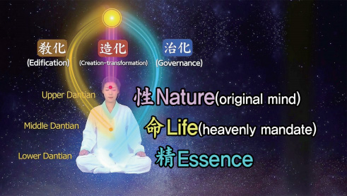이 상단, 머리 중심에 조물주 신이 있어요. 그 신의 조화의 마음을 성性이라 합니다. 인간의 본래 참마음, 본체 마음, 심체心體를 말합니다. 그 성이 조물주 신, 원신元神으로 발현됩니다. 조물주 신, 원신은 보통 모든 인간에게 잠들어 있습니다. 거의 모든 인간이 이걸 못 깨우고 그냥 죽습니다. 그리고 우리의 생명이라는 명命은 가슴에 있습니다. 그다음에 하단의 정精은 온몸을 다스리는 에너지입니다. 신경도 다스리고, 오장육부도 다스리고, 마음의 건강, 평화로움, 지혜, 용기를 다스려요. 이 세 가지를 오묘한 관문 즉 현관玄關이라 합니다.