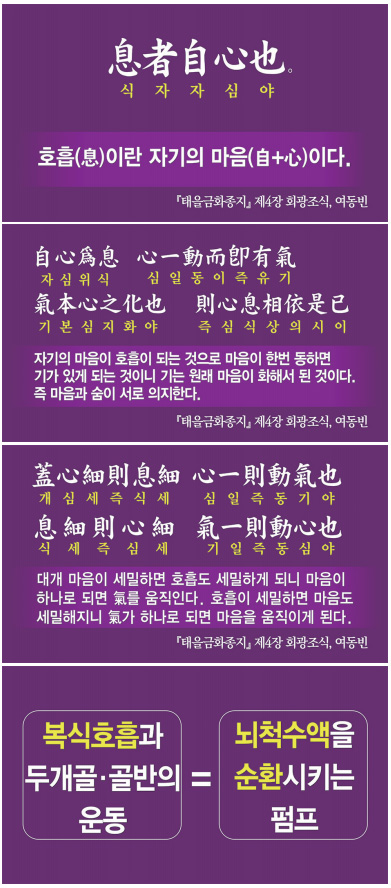 수행을 할 때는 아랫배로 호흡이 되는 걸 느끼면서, 아래쪽 현관에 생각을 자연스럽게 집중합니다. 집에서 홀로 주문을 읽을 때는 가족이 자니까 작은 소리로 묵송默誦합니다. 동쪽을 향하거나 남쪽을 향해 앉아서 허리띠를 끄르고, 허리를 펴고 주문을 읽습니다.