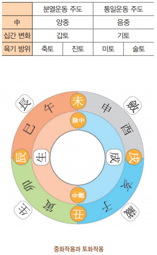 통일과 분산을 본체면에서 보면 통일은 미未에서 시작하고 분산은 축丑에서 시작한다. 그러나 이것을 작용면에서 보면 통일 현상은 술戌에서 나타나고 분산 현상은 진辰에서 나타나는 것이다.…그런즉 체體로써 보면 진술辰戌은 중中이고 축미丑未는 본말本末이다. 반면으로 용用에서 보면 축미丑未가 중中이고 진술辰戌이 본말本末이 되는 것이다. - 『우주변화의 원리』 227쪽