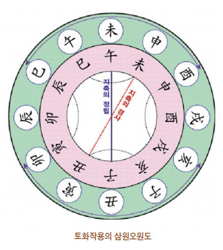 ‘자축인·묘진사·오미신·유술해’와 같이 토를 중심으로 본중말 운동을 하는 것을 토화작용의 삼원운동三元運動이라고 합니다. 삼원운동은 지축이 경사진 선천에 일어나는 현상입니다. 토를 중심으로 본과 말에 독음이나 독양이 있으므로 부조화의 변고가 발생합니다. ‘해자축인묘·사오미신유술’과 같이 토를 중심으로 본중말 운동을 하는 것을 토화작용의 오원운동五元運動이라고 합니다. 오원운동은 지축이 정립한 후천에 일어나는 현상입니다. 토를 중심으로 본과 말에 정음정양이 있어서 조화로운 변화가 일어납니다. 물론 오원운동은 지축의 경선인 축미丑未를 중심으로 파악할 수도 있고, 위선인 진술辰戌을 중심으로 파악할 수도 있습니다.
