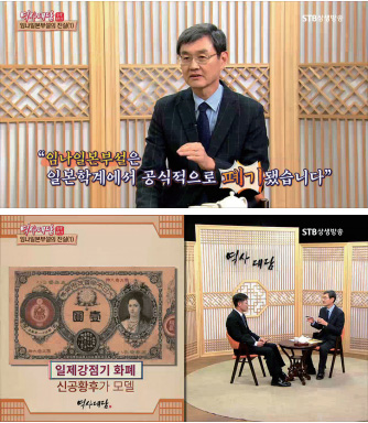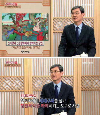임나일본부설이라고 하면 시청자분들은 조금 생소하실 수도 있지만 일본 역사교과서에서는 아직도 임나일본부설이 나오고 있습니다. 일본의 제국주의 시절에는 신공황후와 같은 일본 역사왜곡의 핵심인물들의 초상이 그려진 화폐를 유통시키기도 했고, 고구려 백제 신라왕들이 신공황후에게 조공하는, 말도 안되는 삽화를 그려 역사를 조작했습니다. 당시에는 한민족에게 패배주의를 심어주어 항일의식을 마비시키는 도구로 임나일본부설을 활용했던 것입니다.