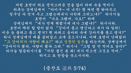 도전에 질문이라는 검색에 나오는 성구는 딱 하나 있습니다. 하느님께 던지는 아이의 질문. “그 강아지가 사람이 돼요?” 아주 유쾌한 장면인데. 강성무극상제姜聖无極上帝님의 아들딸로서 후천 사람으로 거듭나기 위해서 우리 도문에 수많은 사람들을 들여야 하는 시간대를 맞았어요. 우리가 그런 질문들의 세계에 투신해야 한다
