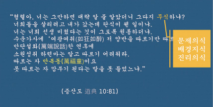 첫째 문제의식이 없어요. 어느 때인지 몰라. 아주 사소한 문제만이 자기의 문제죠. 두 번째 배경지식이 없어요. 배경지식이 없으니까 가르치는 입장에서 요리할 재료가 없는 거예요. 그래서 문제의식을 심어주고, 배경지식을 깔아주는 겁니다. 그런 연후에야 구슬을 하나로 꿰는 행위, 도담을 통해서 진리의식을 심어주는 일이 이어지는 것이죠. 바로 이 세 가지. 문제의식, 배경지식, 진리의식을 심는 행위가 설득의 바탕에 깔려있는 일이다. 그러면 만복동萬福童이 될 수 있다 이 말이죠.