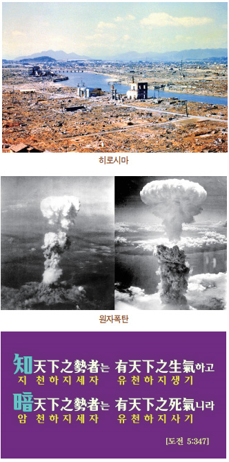 일본이 제 뿌리를 잡아먹으려 하니까 천상 조화정부에서 천지신명들이 분노해서 응징을 해야 된다고 했습니다. 그래서 상제님이 미국에게 원자폭탄을 맞고 망하도록 하신 거예요. 그렇게 해서 총각판 2차 세계전쟁이 끝나게 되었습니다.