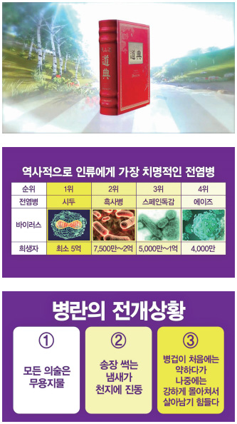 무신년에 상제님께서 “앞으로 병겁이 들어와 천하를 진탕한다. 그래서 동서양의 전쟁은 병으로 판을 고른다.”(道典 7:32)고 하셨습니다. 동양의 모든 전쟁, 서양의 모든 전쟁은 병으로써 다 끝낸다는 것입니다. 병란은 내전이나 갈등을 한순간에 봉합시키고 화해를 하게 합니다. 이 병란의 깊은 섭리, 천도적 섭리 그리고 문명사의 진정한 섭리의 손길을 생각하지 않을 수가 없는 것입니다.