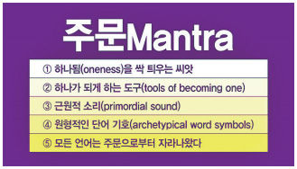 만트라를 정신적 도구니, 마음의 도구니 이렇게 말하기도 하는데 불교에서 공안을 수천 번, 수만 번, 수십 년 궁구하면 ‘아, 공안이 소리구나’ 하는 것을 깨닫게 됩니다. 그래서 주문은 우리로 하여금 온 우주와 하나 되게 싹을 틔우는 씨앗입니다. 원천적인 영원한 생명의 씨앗이에요. 주문은 근원의 소리입니다. 영원한 우주의 역사문화 창조의 원형이고, 진리 언어의 원형적인 상징입니다. 모든 지구촌 언어는 주문에서 이루어진 것입니다.