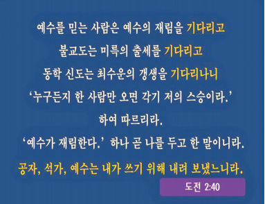 지금 선천에서 후천으로 넘어가는 시점이잖아요. 선천, 후천의 극명한 차이를 여러 가지 형태로 느끼게 되는데요. 아침에 수도꼭지를 트는데 샤워기에서 물이 나오는, 그런 황당한 경우를 당한 적 있죠? 수도꼭지가 선천이라면 샤워기는 후천이라고 비유해 보세요. “내가 세상을 돌려놓았음을 세상이 어찌 알리오.” 기운이, 녹이 흐르는 모든 방향이 샤워기로 가있는데 우리는 수도꼭지만 틀고 있는 거예요. 진리도 선천진리 틀고 있는데, 운로가 바뀌어 있다는 사실을 일깨워줘야 된다는 거죠. 그걸 모르면 물이 안 나오는 수도꼭지 틀고 있다가 봉변당하게 되거든요.