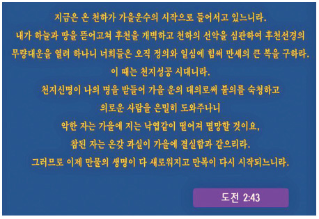 증산도가 뭐냐 물었을 때 증산도는 종교가 아니다라는 얘기를 꼭 합니다. 괜히 ‘도’가 아니잖아요. 그럼 증산도가 뭘까요. 우리가 서전서문을 외우는데 포교할 때는 저는 도전 서문을 더 많이 읽습니다. 1992년판에서 첫 문장은 제가 너무 좋아하는 구절인데, 외워서 현장에서 내어 쓰기에 좋습니다.