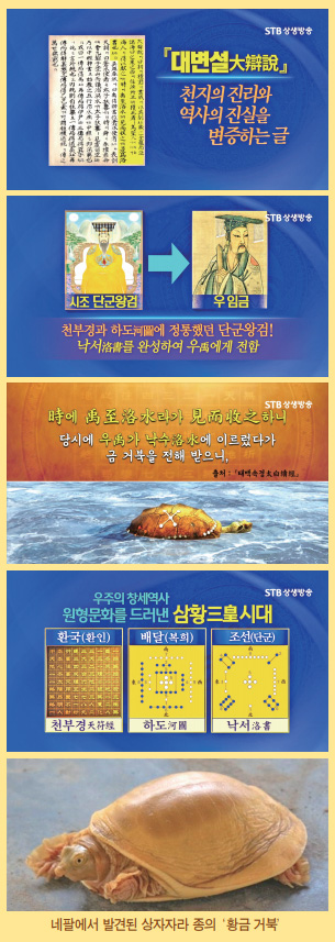 그 내용은 다음과 같다. 단군왕검이 아주 희귀한 금 거북이를 잡아서 그 등에다가 2·7·6, 9·5·1, 4·3·8, 낙서洛書를 써서 바다에다 띄우면서 이런 말씀을 하셨다. “네가 지동지서之東之西, 동쪽으로 가든 서쪽으로 가든, 네가 가는 대로 맡긴다. 이것을 얻는 자는 성인聖人이리라.” 그래서 바다에 보냈는데 낙수洛水라는 곳에서 해인海人 곧 어부에게 잡혔는데, 홍수를 다스리기 위해서 고민하던 우禹가 그 옆을 지나다가 그것을 얻었다. 그래서 우가 진짜 성인이 된 것이다. 단군왕검께서 천지의 구수, 바로 「천부경」과 하도河圖의 수의 이치에 도를 통해서, 금 거북이 등에다가 낙서의 숫자를 써서 띄웠던 것이다.