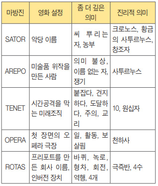 사토르 마방진의 이 다섯 단어는 영화의 핵심 뼈대다. 이 다섯 개의 라틴어는 사각형 대칭 모양 내에서 2차원 회문으로 배열된다. 전통적인 해석으로는 ‘농부 아레포가 바퀴를 굴리는 일(=밭을 가는 일)을 하는 것’으로 해석된다고 한다. 모든 마방진은 낙서에서 출발했다. 낙서는 천부경에서 나왔다. 천부경은 인류 최초의 계시록이며 선후천 개벽의 이치를 담고 있다.