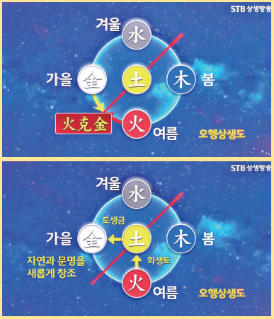 지금은 우주의 봄여름이 바뀌는 하추교역기夏秋交易期, 금화교역기金火交易期다. 여름에서 가을로 넘어갈 때는 화극금火克金하기 때문에 개벽이 일어난다. 10미토十未土 상제님께서 오셔서 화생토火生土, 토생금土生金하여 여름과 가을을 이어주신다. 상제님은 상극相克 세상에서 상생相生의 세상으로 넘어가는 생명의 다리를 놓아주셨다. - 태상종도사님 도훈