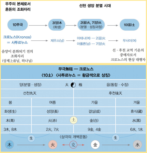 여기서 중요한 것이 ‘크로노스 → 제우스 → 아테나 → 아폴론 → 무사이’로 이어지는 탄생의 순서가 바로 동양의 우주원리로 볼 때, 인간의 영혼(정신)이 창조되어 진화·발전하는, 선천에 우주생명이 순환하는 과정을 말해주고 있다는 사실이다. (『이것이 개벽이다』 상권, 우주원리로 풀어보는 그리스 신화 요약 정리)