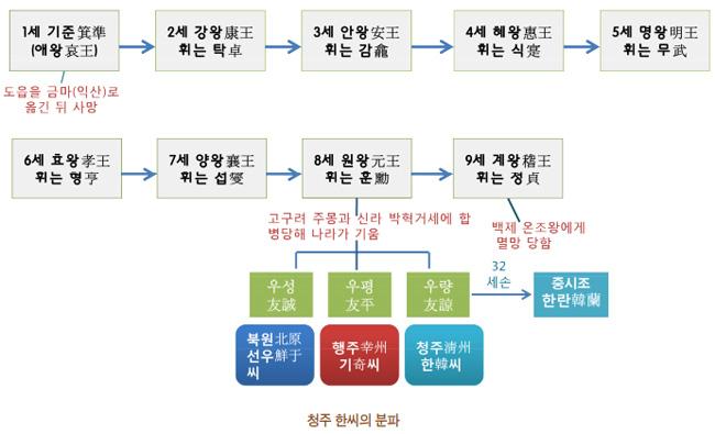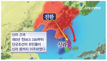 우리 역사를 보면 오래전 북방민이 한반도에 정착해 역사를 개척하여 지금까지 이어지고 있는 것은 분명한 사실이다. 『삼국사기』에서도 “이보다 먼저 조선의 유민들이 산과 계곡에 흩어져 살았는데 이들이 진한의 육촌을 이루었고, 이들을 일러 진한 육부라 했다(先是 朝鮮遺民 分居山谷之問 爲六村…是爲辰韓六部)”라는 기록이 있다. 조선의 유민遺民이라면 고조선(단군조선)의 유민을 말한다. 『환단고기』 「단군세기」에 따르면 기원전 238년에 단군조선의 마지막 47세 고열가단군이 자리를 내놓고 은둔하셨기 때문에, 신라 건국(BCE 68) 약 180년 전부터 단군조선의 유민들이 신라 땅으로 이주하여 살았던 것이다. 『우리 역사를 바꾼 귀화 성씨』에서는 최초의 한반도 귀화 사건을 중국의 은나라가 망한 후 ‘기자箕子’가 고조선에 망명한 사건으로 이야기하고 있다. 우리나라에서 가장 오래된 성씨 가운데 하나인 청주淸州 한韓씨의 시조가 바로 ‘기자’이다. 「청주한씨세보淸州韓氏世譜」에 따르면 기자조선의 마지막 준왕의 후손 중에 우성友誠·우평友平·우량友諒 삼 형제가 각각 고구려와 백제, 신라로 귀의해 우성은 행주幸州 기奇씨, 우량은 상당上黨 한韓씨, 우평은 북원北元 선우鮮于씨가 되었다고 한다.