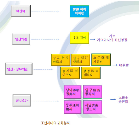 조선 초기에는 여진족에 대한 귀화 정책이 적극 실시되었다. 이성계과 의형제를 맺었던 여진족의 이지란李之蘭이 1천 명 정도의 부하를 거느리고 와서 조선을 창업하는 데 일등 공신이 되면서 청해青海 이李씨의 시조가 된다. 16세기 말 임진왜란과 정유재란을 거치면서 많은 일본군과 명明나라군이 자의 반 타의 반으로 귀화하게 된다. 정유재란 때 명군을 인솔하고 들어온 상곡上谷 마麻씨의 시조 마귀麻貴 제독이 있다. 그 밖에 절강浙江 팽彭씨, 소주蘇州 가賈씨, 농서隴西 이李씨, 광동廣東 진陳씨 등도 선조가 명나라 지원군의 일원이었다. 이렇게 지원군으로 들어왔다가 조선에 정착한 사람들의 후손들이 4백 년의 뿌리를 더듬어 한데 모인 단체가 있다. 바로 ‘명의회明義會’다. 명말明末 청초淸初의 혼란기에 조선에 망명해 한국인이 된 중국계 귀화 성씨의 후예들이 서로 간의 친목과 조상 공경을 위한 모임을 조직한 것이다.