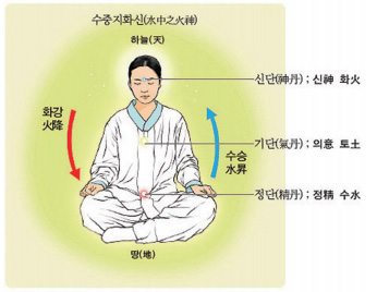 수행이라는 것은 내 몸을 태극으로 만드는 것이다. 내 몸과 마음을 우주의 본체 태극으로 만드는 공부의 단계를 수승화강水昇火降이라 말하기도 한다. 심장과 신장에 있는 진양眞陽과 진음眞陰을 바꿔서 교구交媾를 시키는 것이다. 이것이 수행의 기초 틀이다.