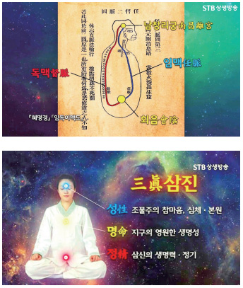 우리는 대우주의 궁극의 근원, ‘하나’를 가지고 왔다. 「천부경」에서 말한 ‘일’, 그 하나다. 그것이 몸에서 셋으로 나누어져 있다. ‘석삼극析三極 무진본無盡本’, 셋으로 나눠져 있다. 그래도 그 근본은 다함이 없다. 우주의 그 절대 조화를 그대로 가지고 있는 것이다. 우리 몸에 삼신이 들어와서 성명정性命精이 된 것이다. 이 우주의 조화신의 마음은 내 머릿속에 깃들고, 가슴 중앙에는 삼신의 영원한 생명이 있다. 그다음에 삼신의 영원한 그 정력은 바로 하단전에 가지고 있다. 이 세 가지가 바로 성명정이다.