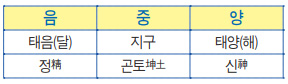 *4) 천지는 공간을 만들고, 일월은 시간을 만든다. 또한 일체삼용一體三用의 원리에 따라 천天은 체體가 되고, 지일월地日月은 용用이 되어 만물을 기르고 있다.