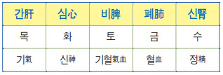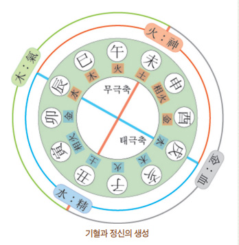 위의 도표처럼 정精은 수水, 신神은 화火, 기氣는 목木, 혈血은 금金에 배속할 수 있습니다. 그러므로 수화의 운동이 곧 정신의 생성운동이고, 목금의 운동이 기혈의 생성운동이라고 할 수 있습니다.