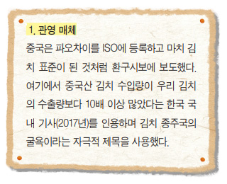 파오차이는 얼마 전 ISO(국제 표준화 기구)에서 제조법을 인증받았다. 중국 공산당 기관지인 환구시보가 이 인증 소식을 전하면서 마치 한국 김치는 인증을 받지 못한 것처럼 ‘김치 종주국 한국의 굴욕’이라는 제목을 단다. 이런 영향으로 국내 네티즌들 사이에 논란이 일어난다. 피클 맛에 가까운 파오차이가 조리법도 전혀 다른 김치의 원조라는 이야기가 나오기 시작한다. 우리 김치가 인증받은 Codex(국제 식품 규격 위원회)는 국제 규격인데, 중국이 파오차이 인증을 받은 ISO는 민간단체 규격이다. 우리나라의 농림축산식품부 트위터에는 이런 글이 올라와 있다. “중국의 파오차이는 우리나라의 김치와 전혀 관련이 없습니다. 파오차이가 기재된 ISO/FDIS 24220 문서에 ‘이 문서에는 김치가 적용되지 않는다’라고 명시되어 있습니다.”