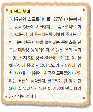 댓글은 이런 내용이다. “아 이거 보니까 또 열 받네. 중국 놈들이 이젠 쌈도 지네 전통문화라고 하고 있던데.” 중국 유튜버들이 쌈 문화도 자기들 거라고 올려놓은 영상을 보고 화가 난 한국 네티즌의 댓글인데, 여기에 좋아요를 누른 것이다. 이 내용이 중국 포털 실시간 검색어 1위에 올랐다. 그 후 수많은 중국인들의 댓글이 달린다.