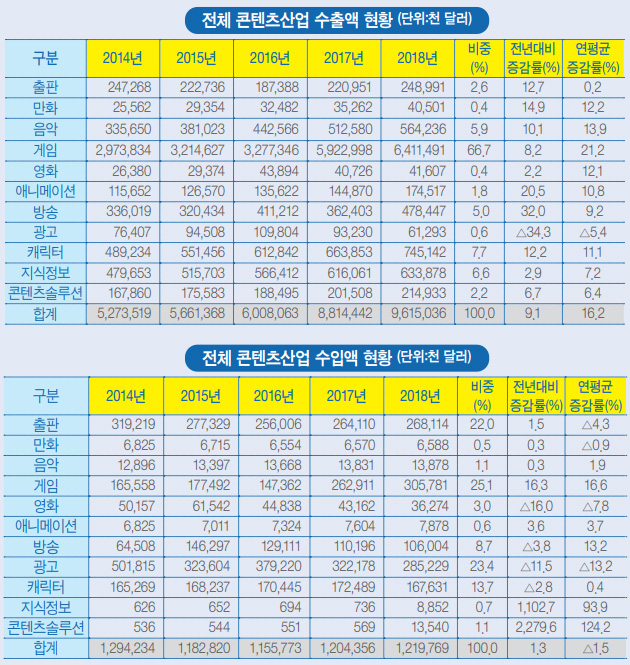 수출액 규모는 게임 산업이 64억 1,149만 달러로 가장 많았다. 게임 산업 수출액은 2015년 29억 32억 1,462만 달러에서 연평균 21.2% 증가했다. 게임에 이어 캐릭터(7억 4,514만 달러), 지식 정보(6억 3,388만 달러), 음악(5억 6,424만 달러) 등의 순으로 나타났다. 한류의 영향으로 콘텐츠 산업 수출액은 지난 5년간(2014∼2018년) 연평균 16.2%의 높은 성장률을 유지했다.